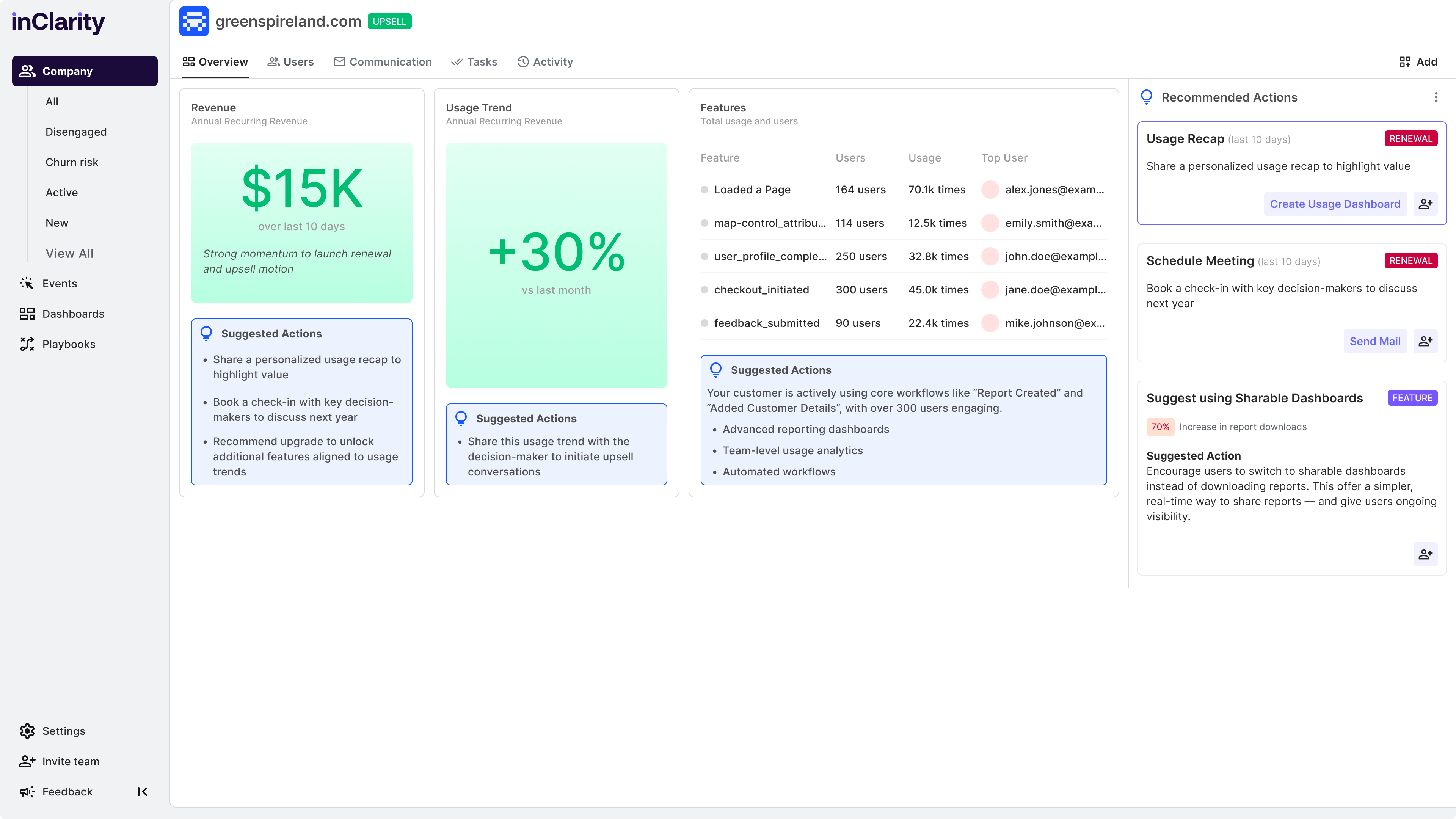 Get inClarity to turn scattered data into step-by-step playbooks your CS team can run today to retain, renew and expand revenue.